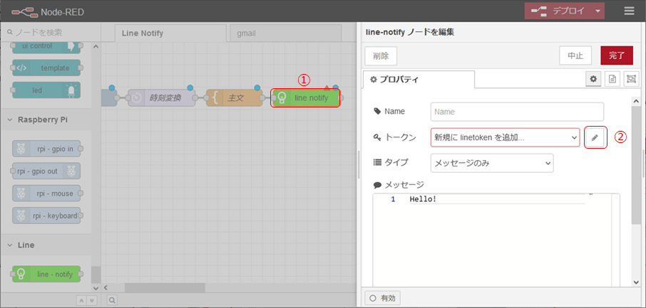 ここでは、「Node-REDからGmailを送信」で作成したNode-REDのフローをベースにLine-Notifyノードを追加することで、Line-Notifyにメッセージを送る実験をします。