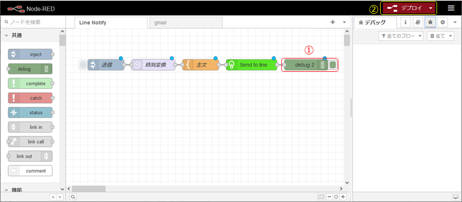 ① debugノードを配置し、 line-Notifyノードと接続します。