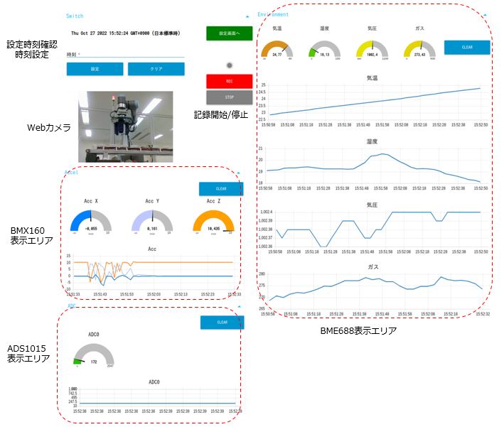 センサモジュールからのデータが受信できている時は、PDH本体の緑ランプがデータ受信に合わせて点滅し、ダッシュボードの画面でゲージやチャートに値が表示されています。