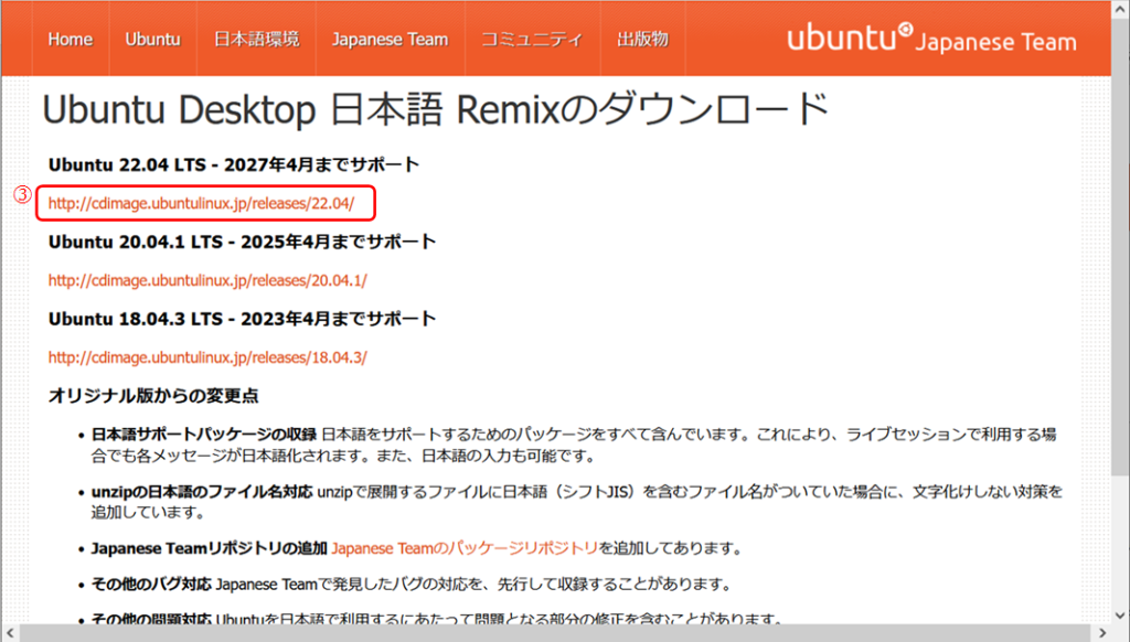 ③ 「Ubuntu 22.04 LTS – 2027年4月までサポート」をクリックします。