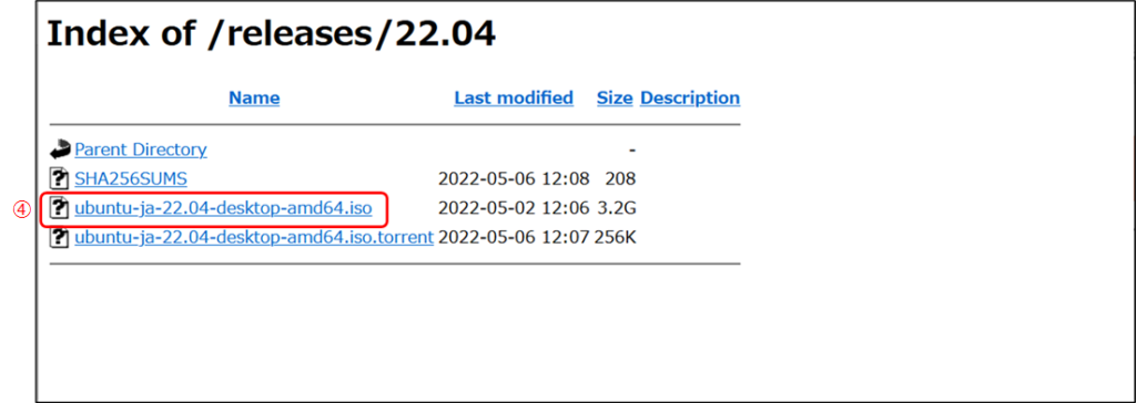 ④ 「ubuntu-ja-22.04-desktop-amd64.iso」をクリックするとダウンロードが始まります。