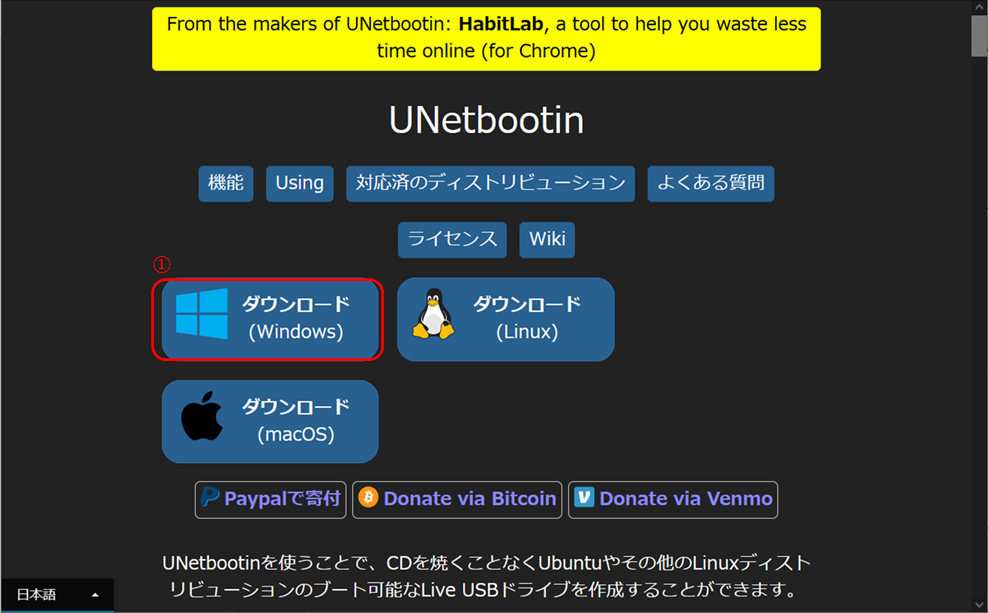 ダウンロードしたisoファイルからブート可能なUSBドライブ作成するツール UNetbootin をダウンロードするためのHPに移動します。
