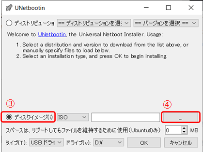 ④ isoファイルを指定するため、「・・・」ボタンをクリックします。