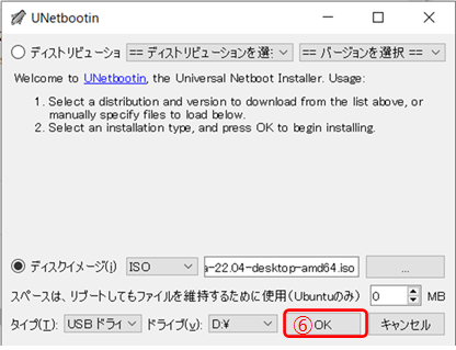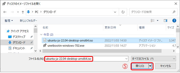 ⑤ 「ubuntu-ja-22.04-desktop-amd64.iso」を選択して「開く」を押します。