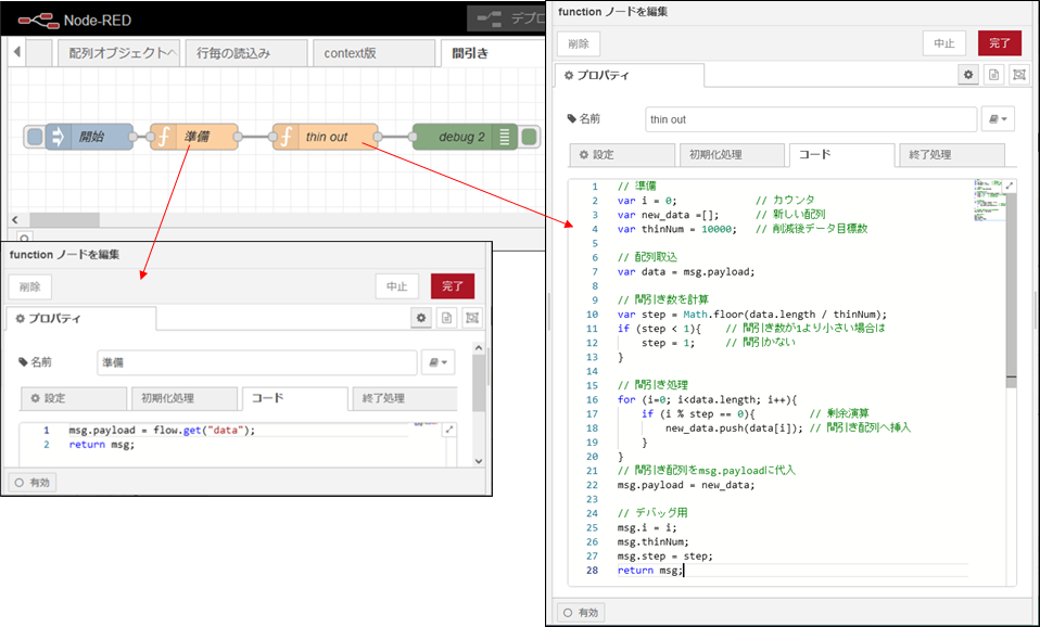 injectノードとfunctionノード2つとデバッグノードで構成されています。主要ノードは「thin out」のfunctionノードです。