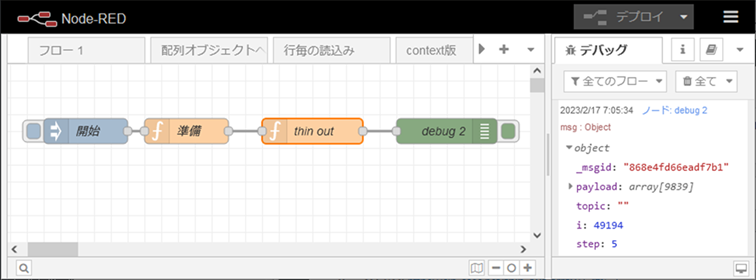 msg.payloadの配列数が9,839です。それに対して元の配列のデータ数 i が49,194です。間引き数step は、 49,194 ÷ 10,000 = 4.9194 を四捨五入した 5 になっています。目標データ数の10,000に間引かれていることが分かります。