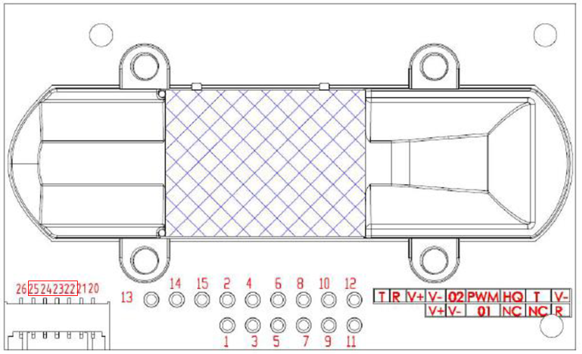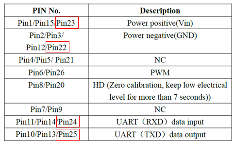 MH-Z14Bのインターフェース端子一覧と端子配置図を以下に示します。Pin22~Pin25 の4本を使用します。