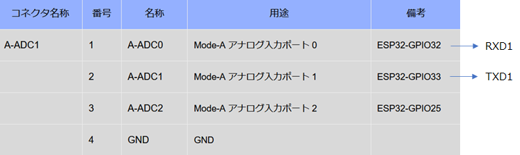 RX1端子は、コネクタA-ADC1(J10)の端子1:A-ADC0(ESP32-GPIO32)です。TX2端子は、コネクタA-ADC1(J10)の端子2:A-ADC1(ESP32-GPIO33)です。この端子は、Mode-D (デジタルセンサモード)の時のみUARTインターフェース対応端子として使用可能です。