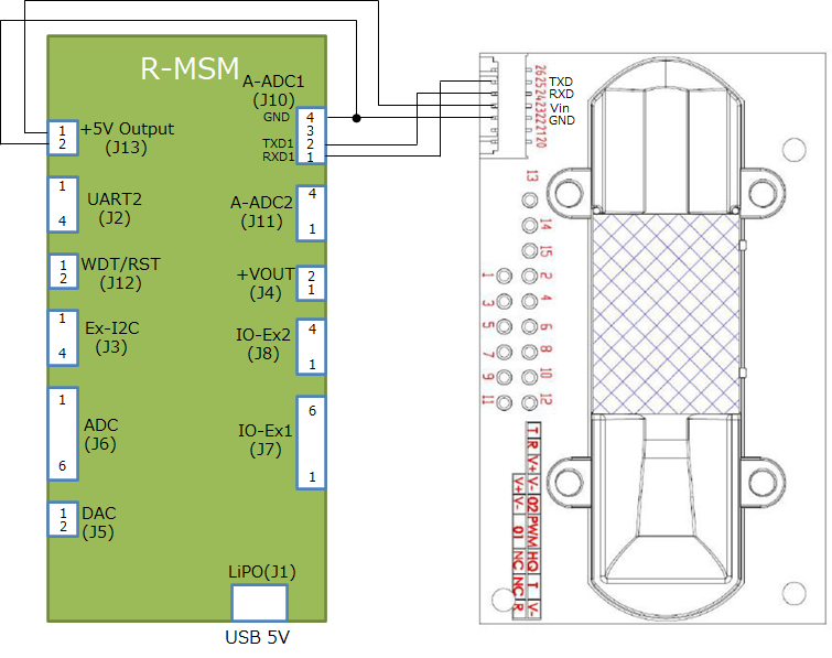 ここでは、市販の二酸化炭素センサMH-Z14Bを外部センサとして用います。MH-Z14BとR-MSMをUART通信で接続しデータの取得を行います。