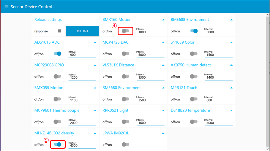 ④ MH-Z14Bは動作が遅いので、早く動作する必要があるセンサはオフします。ここでは、BMX160をオフにします。BMX160のチェックボタンをOFF側に倒します。