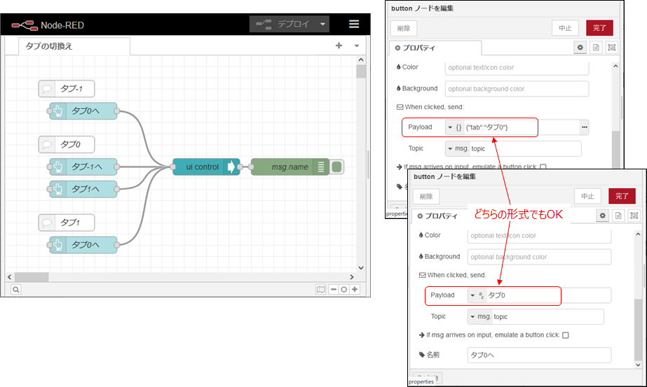 それぞれのタブに他のタブに移動するためのbuttonノードを配置します。buttonノードのpayloadには、移動先のタブ名を記載します。形式は、ヘルプ画面に書かれているように、JSON形式で{“tab”:タブ0}でも、文字形式で タブ0 でもOKです。