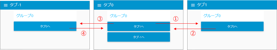 ① タブ0で「タブ1へ」のボタンを押すとタブ1に画面が切り替わります。