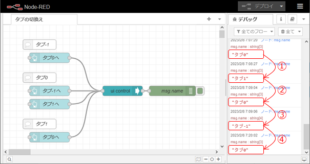 デバッグ画面を確認します。タブ移動に合わせて、ui controlノードからmsg.nameに移動した先のタブ名が出力されます。これは、buttonノードで移動した場合だけではなく、手動でタブを切り替えても出力されます。タブの切換を検知して、何かイベントを起こす際に使えます。「5.タブ変更検知の応用」を参照ください。