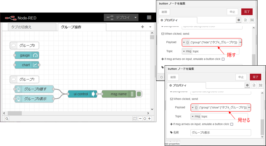 二つ目がmsg.payloadで送られてきた指示に従って、グループを隠したり、見せたりすること。