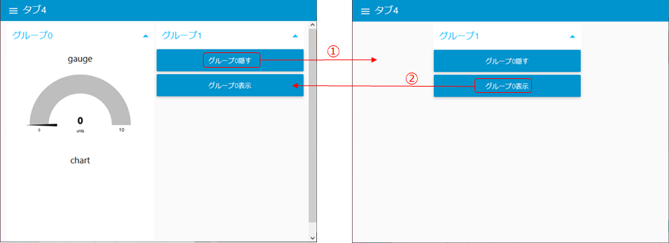 ① 左側の画面で、「グループ0を隠す」ボタンを押すと、右側画面のように、グループ0が完全に消えます。