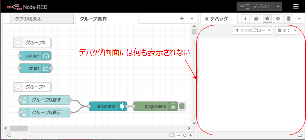 ui controlノードのヘルプに記載のある機能の2つ目について説明します。2つ目の機能は、 msg.payloadで送られてきた指示に従って、グループを隠したり、見せたりすることです。動作確認のために、以下の様なNode-REDのフローを作りました。タブ4を新設し、その中に、グループ0とグループ1を作ります。グループ0には、ゲージとチャートを配置します。そしてグループ1には、buttonノードを2つ配置し、一方には、グループ0を隠すmsg.payload={“group”:{“hide”:[“タブ4_グループ0”]}}を出力させます。もう一方には、グループ0を見せるmsg.payload={“group”:{“show”:[“タブ4_グループ0”]}}を出力させます。この2つのbuttonノードの出力をui controlノードに入力します。