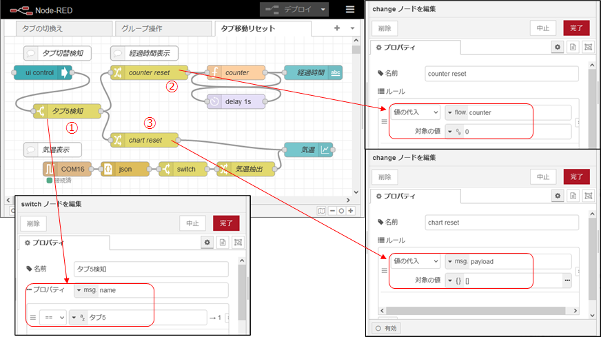 ui controlノードのタブ検知機能を使った応用例として、ダッシュボード上で「タブ5」に切り替えると、1) カウンタをリセットする、2) R-MSMから取得している気温データのチャートをリセットするというのを考えてみました。フローを以下に示します。左上にui controlノードを置いています。入力が無くても、ui controlノードはタブが切り替わると、msg.nameにタブ名を出力してくれます。タブ名がswitchノードで“タブ5”かどうかを検出します(①)。“タブ5”であれば、changeノードを使って、”flow.counter=0”にセットします(②)。また、気温チャートにjason形式で空配列”[]”を送ります(③)。