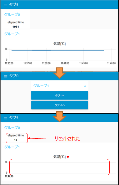 ③ 再度タブ5に切り替えます。経過時間と気温チャートがリセットされました。