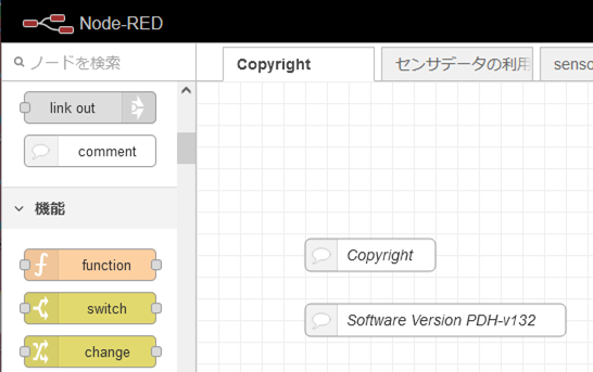 Node-REDのフローエディタを開いてCopyrightのタブを選択すると、フローのソフトウェアバージョンを見ることができます。