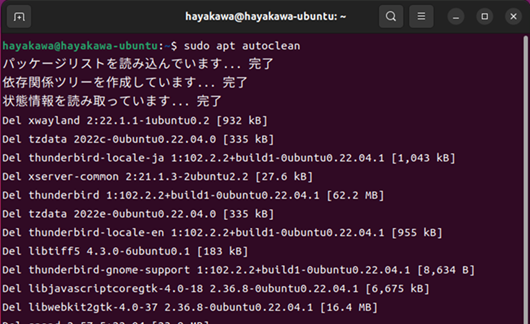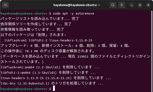 apt autoremove で不要になったファイルを削除します。さらに、apt autoclean で不要ファイルを削除します。