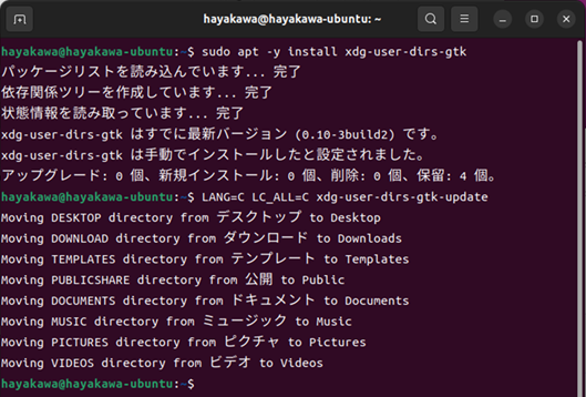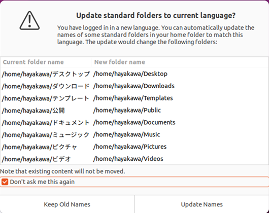 ルートの下のフォルダ名をカタカナから英語に変えます。例えば、デスクトップをDesktopに、ダウンロードをDownloadsに変更します。