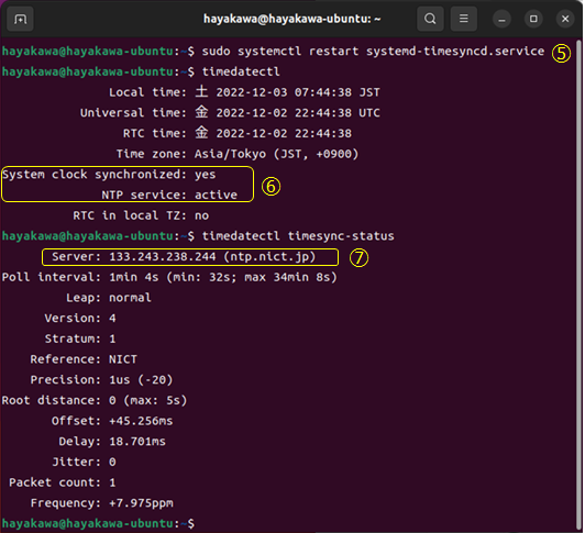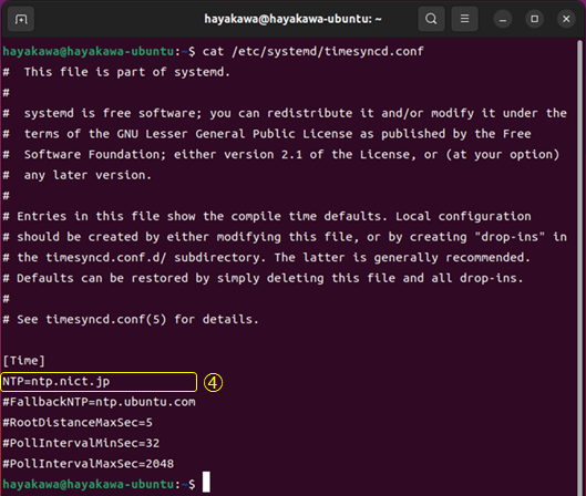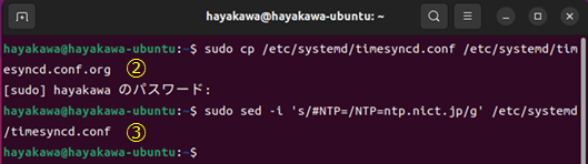 - 2) 時刻の同期先を、ntp.nict.jpに変更