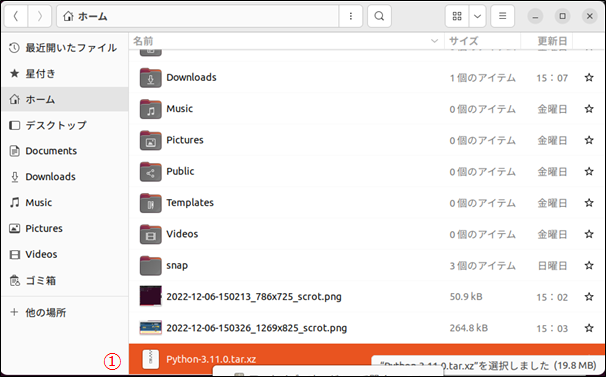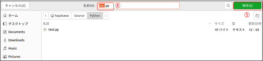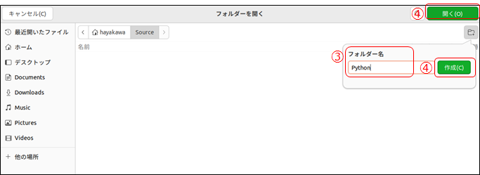④ 作成を押します。ここでは、ホームの下に、“Source”フォルダを作成し、その下に“python”フォルダを作成します。