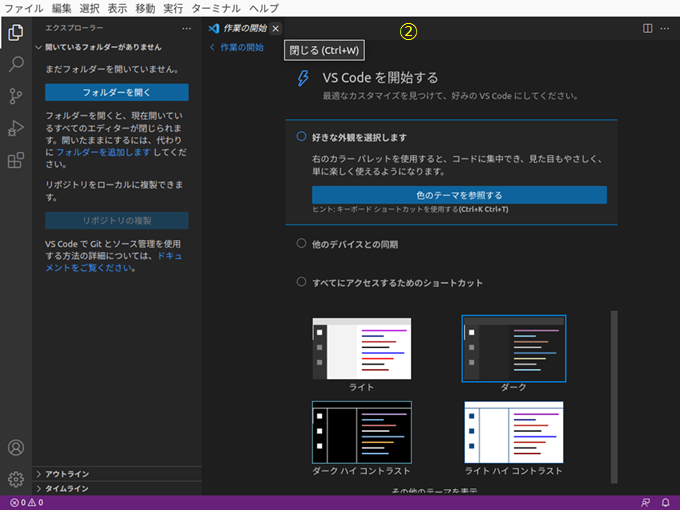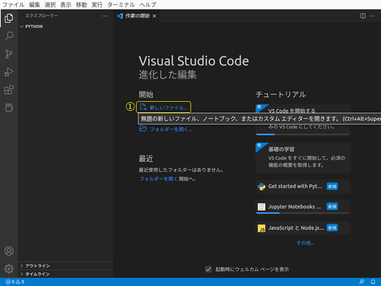 ① 左のメニューの一番上のエクスプローラをクリックします。