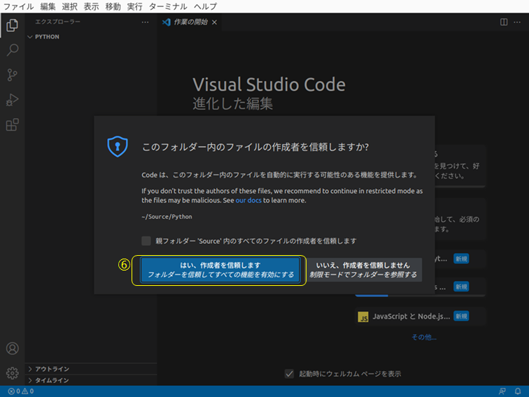 ⑥ 「このフォルダ内のファイルの作成者を信用しますか?」と聞いてきますので、「はい、作成者を信頼します」を押します。