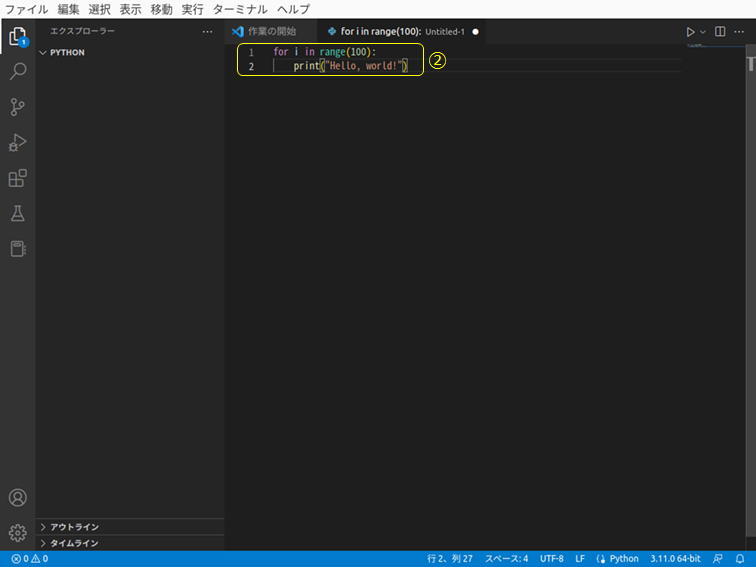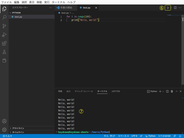 ⑦ ここでは、“Hello, world!”が100回表示されます。