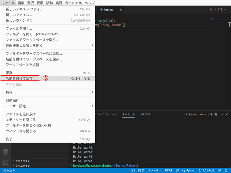 ③ ファイルを保存するために、「ファイル」メニューを開き、「名前を付けて保存」をクリックします。