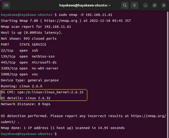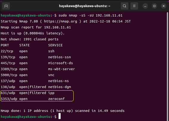 ここでは、自分(Ubuntuマシン)のポートを調べてみます。