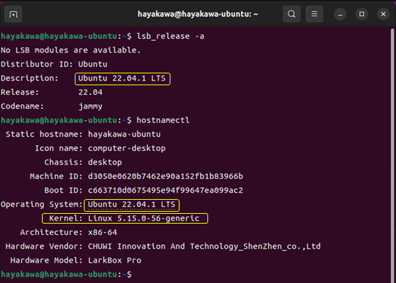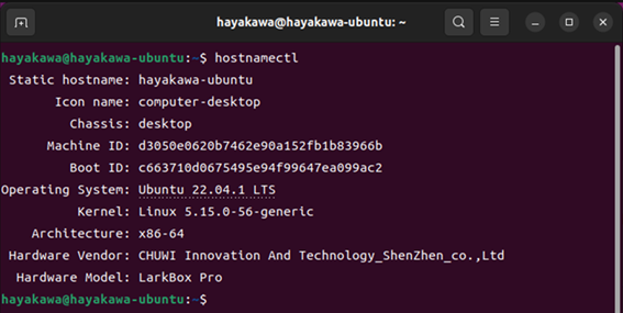 実際には、以下の’hostnamectl’のKernelの項にあるように Linux 5.15.0-56-gnenricです。