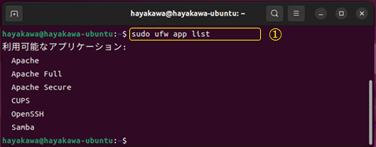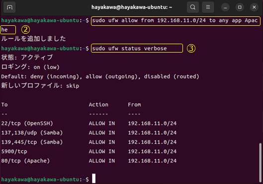 ② “Apache”が存在しますので、これを使って、ufwの設定を行います(許可するIPアドレスは各自の環境に合わせてください)。