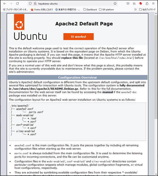 ブラウザで、“http://(Ubuntuのホスト名 or IPアドレス)/”にアクセスします。下記の様な表示がされればOKです。