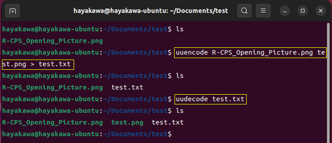 以下の例では、uuencodeしてできた“test.txt”をバイナリファイルに戻しています。変換後、自動的に“test.png”というファイルができます。