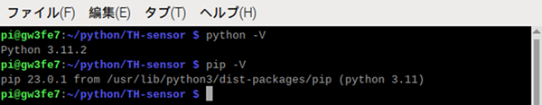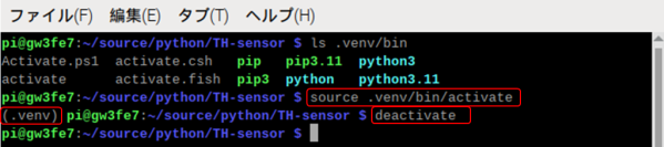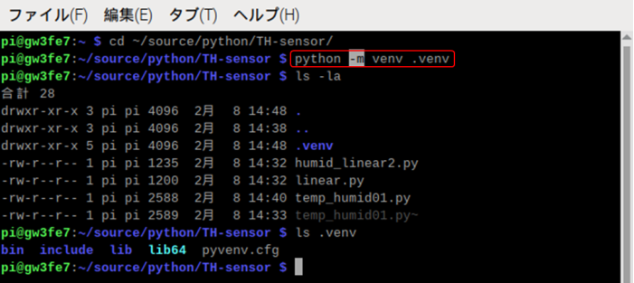 ここでは、~/source/python/TH-sensor/の下にプログラムを置いているので、仮想環境をこのディレクトリの下に作ります。