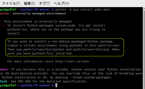 paho.mqttをpipでインストールすると以下の様なエラーが出ます。仮想環境venvを使用して、仮想環境の中にパッケージをインストールする必要があります。