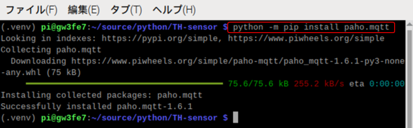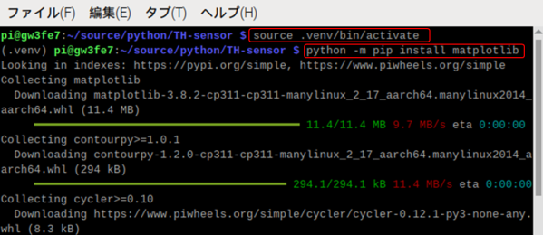 仮想環境に入って、パッケージをpipでインストールします。順番に、matplotlib、paho.mqttをインストールします。