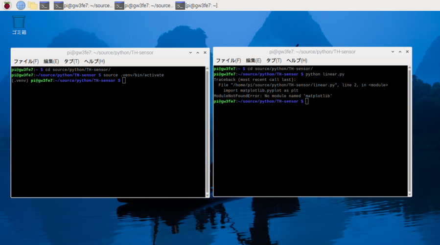 下に示すように、左の端末でactivateを実行し、右の端末画面で、pythonを実行しましたが、matplotlibが無いとエラーになりました。