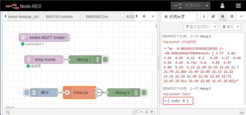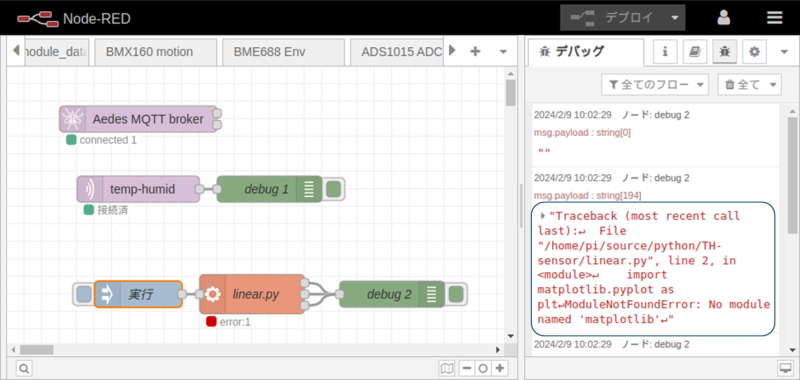 ここまでで、端末画面からの仮想環境の構築に関してはうまく行き、無時にプログラムも動作しました。次に、Node-REDのexecノードではどうかを調べます。