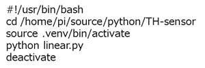 そこで、実行する際に、シェルスクリプトを準備し、その中で①仮想環境を有効にし、②pythonのプログラムを実行し、③仮想環境を無効にします。