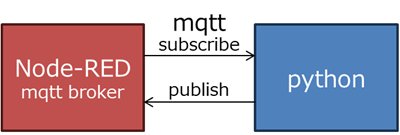 次に、少し特殊なケースになりますが、pythonのプログラムが無限ループを持つ場合を考えてみます。具体的には、下の図のように、PythonのプログラムがNode-REDからサブスクライブしたデータを処理し、結果をパブリッシュで送り返す場合です。この場合、python側では、サブスクライブしているので、無限ループで待っています。pythonのサンプルプログラムは、Appendixに載せてありますので、参考にしてください。