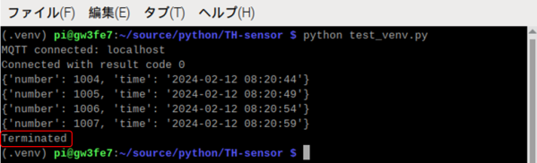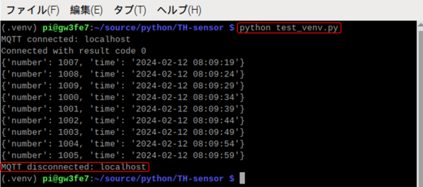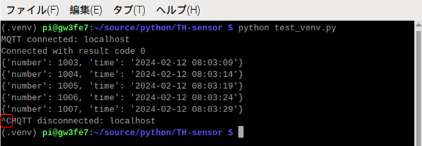 下の図では、端末から、’python test_venv.py’を実行し、終了時にCtrl-c(^C)を入力することで、プログラムがKeboarInterruptの処理に飛んで、後処理後、‘MQTT disconnected: localhost’を表示しています。