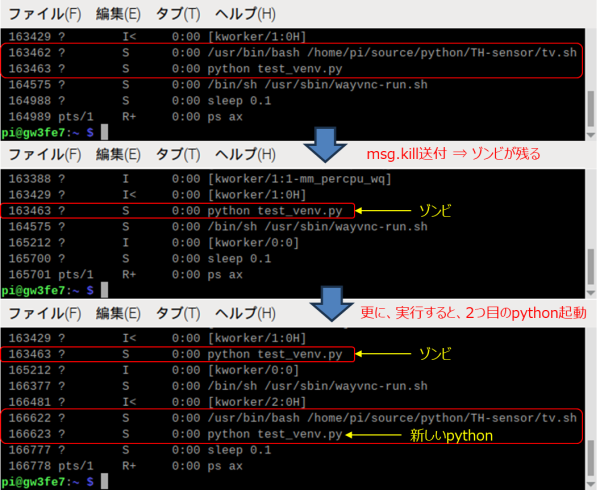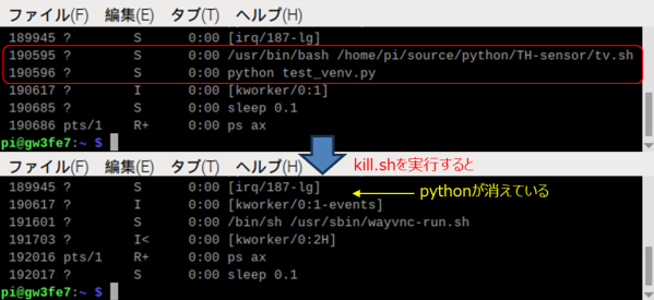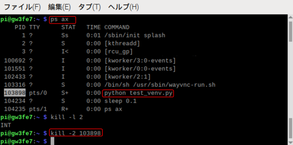 次の2つの端末の上の画面で、’python test_venv.py’を実行しています。下の画面で、‘ps ax’コマンドでプログラムのID番号を調べています。