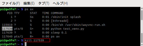 もう一つ止める方法は、実行しているプログラムのID番号を調べて、killコマンドで止める方法です。