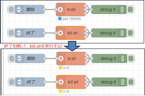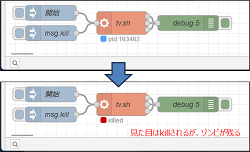 仮想環境ではなかった時には、execノードで起動して、終了時にinjectノードでmsg.killに、“SIGINT”を入れてexecノードに送れば、Ctrl-cで止めたのと同様に止めることが出来ました。しかし、仮想環境になって、シェルスクリプトで実行することになりますので、msg.killをexecノードに送っても、シェルスクリプトが終了するだけで、pythonプログラムは終了しません。ゾンビとして残ります。
