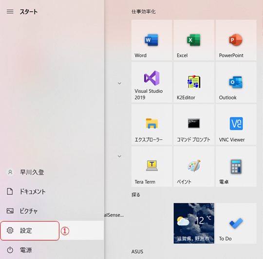 ① スタート画面から、設定を選びます。