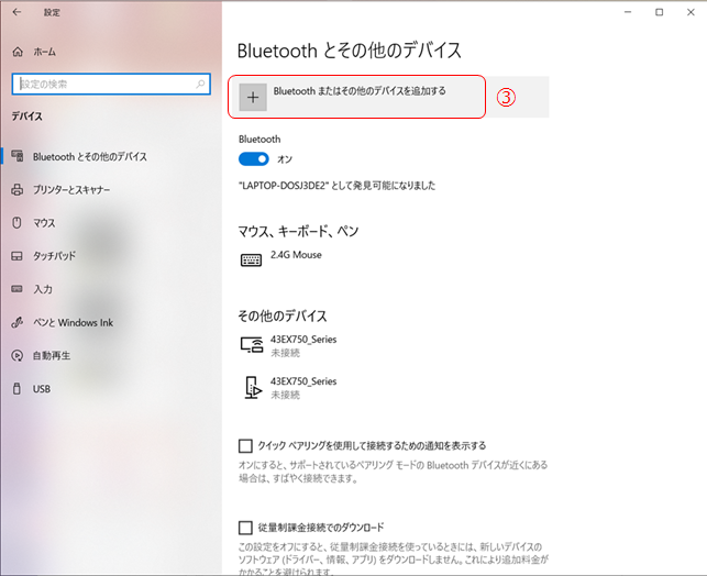 ③ Bluetooth またはその他のデバイスを追加するをクリックします。
