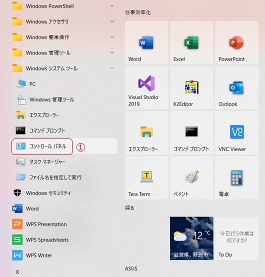 ① スタートメニューから、コントロールパネルを選びます。